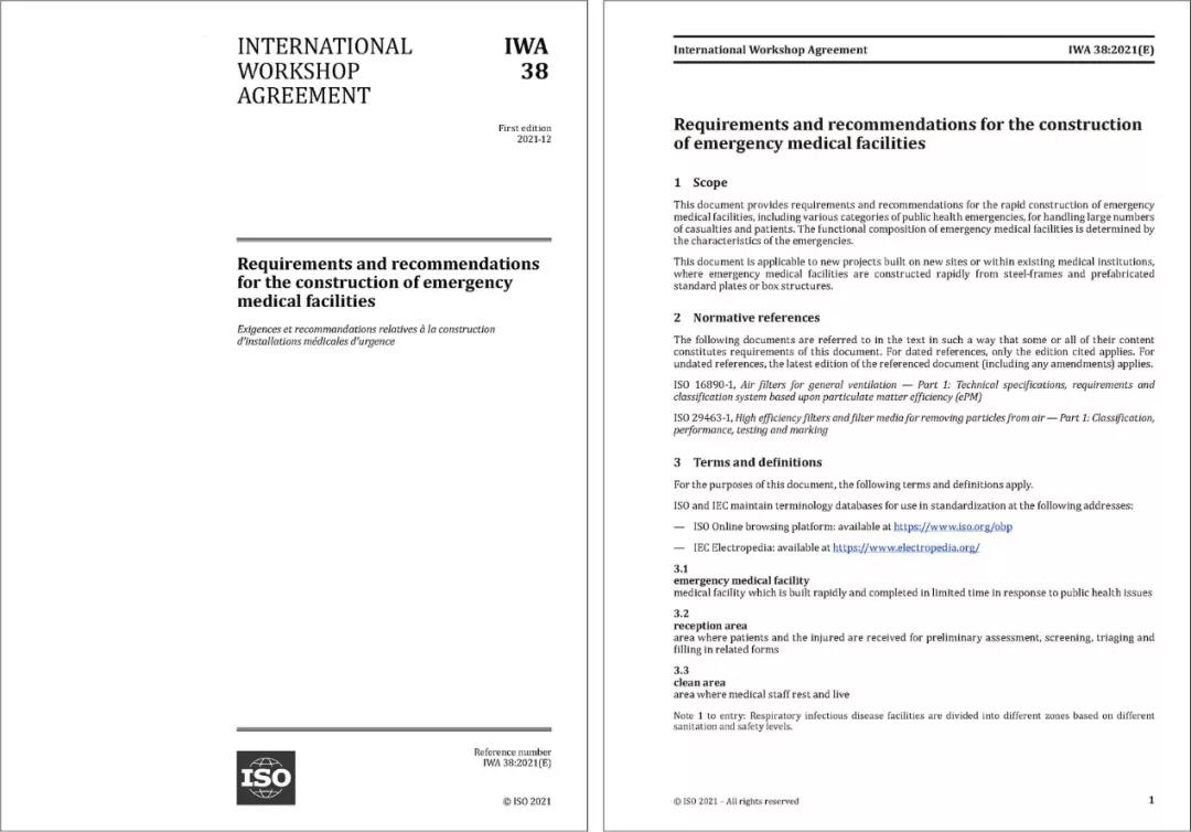 2021年12月20日,國(guó)際標(biāo)準(zhǔn)化組織(ISO)官方網(wǎng)站正式發(fā)布了中國(guó)中元牽頭提出的國(guó)際研討會(huì)協(xié)議IWA 38《應(yīng)急醫(yī)療設(shè)施建設(shè)導(dǎo)則》(以下簡(jiǎn)稱“《導(dǎo)則》”)。